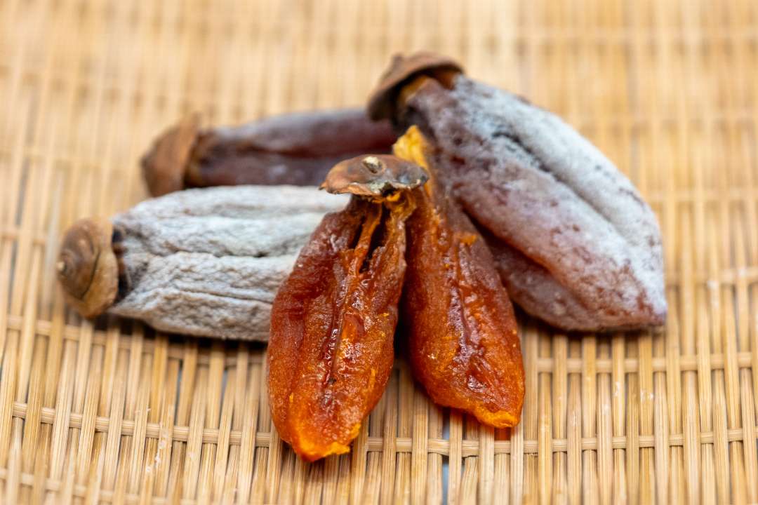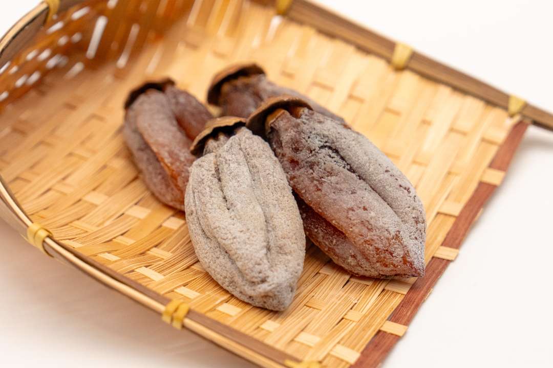 干柿の表面に糖分の結晶である白い粉がふく状態になり、中身はしっとりと柔らかく、極上の柿本来の甘さが口いっぱいに広がります。産地では、吊るし柿としても有名で、「柿色のカーテン」を眺めながら、併設する本園のカフェでは多くのお客様にご愛顧いただいています。